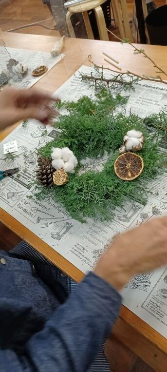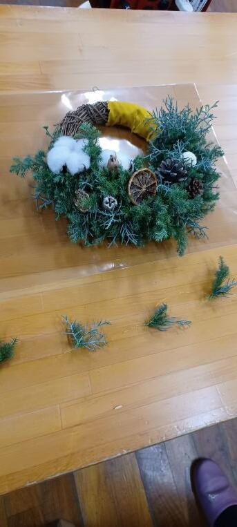 17日に家庭教育学級でクリスマスリース作りをしました。講師(市内の花屋さん)に来ていただき、材料も準備していただいた中で作り方を指導いただきました。今年は、生のコニファーの小枝をメインにしたリースでした。コニファーのかぐわしいにおいがする中、それぞれが各家庭で飾るであろうリースを完成させました。