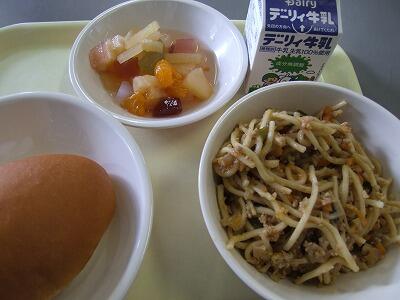 給食は「ミルクパン、スパゲティーナポリタン、コールスローサラダ」でした。給食のナポリタンは、私たちが小学校時の給食でも出ていたような、所謂「昔ながらのスパゲティー」です。いただいていて、なんとなく懐かしい味がします。
