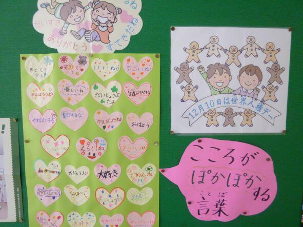 朝は寒い日が続いていますが、写真のような掲示物がありました。保健委員会が掲示してくれている物です。あらためて、人の良さやがんばりに目を向け、褒め称える言葉をかけることで、相手も自分の心もぽかぽかとなりますよね。これから、気温は下がっていくと思いますが、お互いに心はぽかぽかとなっていくよう、言葉かけに留意していきましょう。