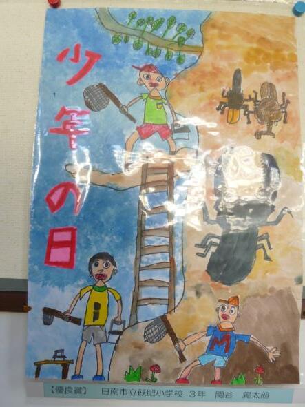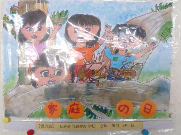 今年もコンクールで入賞等した作品については、コンクール名称、氏名等を玄関に掲示しています。下の作品は、その中の戻ってきた分です。大変子どもらしい絵で、「家庭の日」、「少年の日」のポスターにふさわしい絵です。絵が光って見えにくいのは、汚れないようにビニールで覆われているからです。見にくくてすみません。
