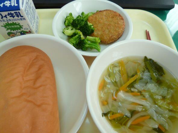 黒糖パン、大根スープ、彩り野菜とキャベツのミンチカツ、ブロッコリー
