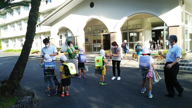 新型コロナ感染拡大の中、新学期が始まりました。朝の登校時に職員による検温や消毒などの感染防止対策をこれまで以上に徹底して、子どもたちを迎えました。子どもたちは、しっかりマスクを着けて、明るく元気よくあいさつを返してくれました。本当に嬉しく思いました。始業式では、6年生の代表が2学期がんばることを発表しました。さすが6年生、飫肥小学校の顔として、下級生のお手本となれるようにがんばりたいと、力強く発表しました。2学期は運動会や修学旅行などたくさんの行事が予定されています。コロナ禍で先行き不透明ですが、できる限り実施できるように感染対策をしていきたいと、職員一同気持ちを新たにした始業式でした。