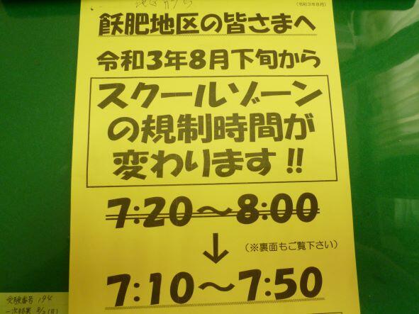 すでに「たより」でもお知らせしていますが、本町の安藤味噌・醤油店付近の交差点から大手門付近までに設定されています「時間規制」の時間が変更されています。これは、児童の登校時間の状況をふまえ、主に自治会長さん達のご尽力によるものです。下の写真のように今までよりも10分早く始まり、10分早く終わります。通勤等でこの道路を通られる方はご注意をお願いします。