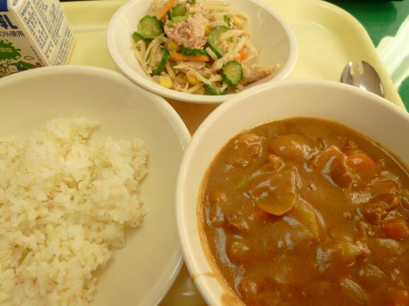 ポークカレー、麦ご飯、牛乳、ゴボウサラダ
