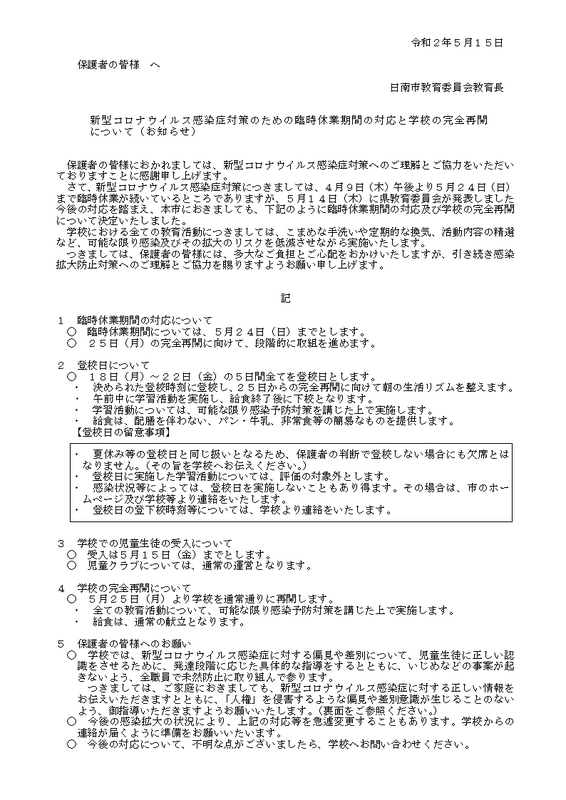 児童クラブに向かうことになります。本日、登校している児童には文書を配付しました。