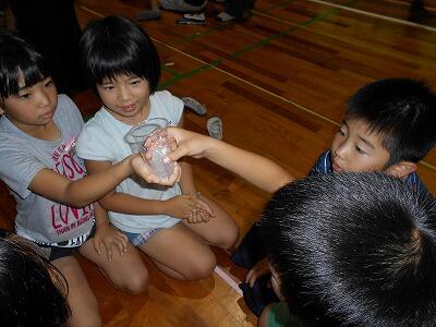 2万年前の南極の氷にも触れることができました。児童は氷の匂いをかぎ、氷に閉じこめられた2万年前の空気が解ける時の「プチプチ」という音に耳を傾けていました。