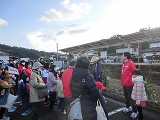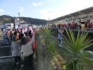 飫肥小学校では児童及び保護者約80名が参加し、飫肥駅での歓迎に参加しました。カープ列車に乗って来られた方々へ、おもてなしの心で温かく歓迎しました。