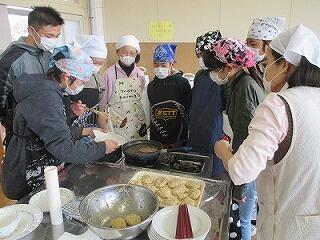 まず、魚のすり身やとうふ、調味料などの材料を手でこねて混ぜ合わせます。形を整えた後は、いよいよ油であげます。油がはねないように、そーっと入れるのが難しかったようですが、みんな上手に入れることができていました。焦げないように気をつけながら、みんなでじーっと天ぷらを見守りました。