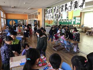 3月1日(木)に、2年生は、1年生を迎えて「おもちゃまつり」を開きました。2年生は、1年生を楽しませようと、工夫して作った楽しいおもちゃを準備し、遊び方をていねいに説明したり、優しく教えたりしながら、仲良く活動していました。