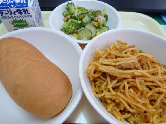 スパゲッティナポリタン、ブロッコリーサラダ、コッペパン、牛乳