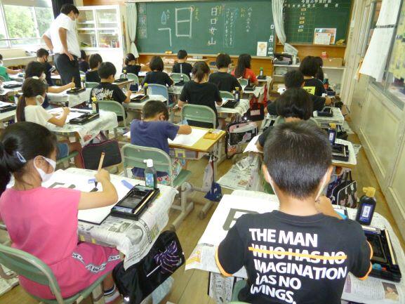 写真は、3年生の習字の学習風景です。担任が、丁寧に指示をしながら静寂の中で練習をしていました。一筆一筆に魂を込めて、と言うような気さえしました。