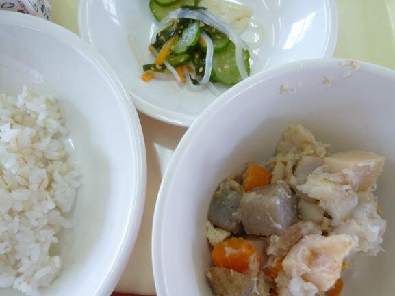 麦ご飯、牛乳、うま煮、キュウリとわかめの酢の物