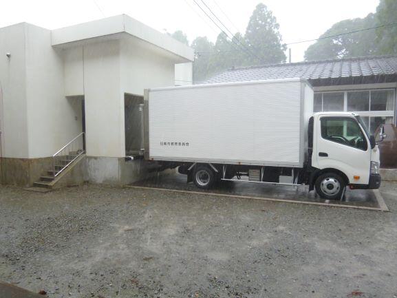酢の物は、小学生向けにやや甘めです。下は、給食が入ったコンテナを運ぶトラックの様子です。午前中に牛乳のトラックが来て牛乳を冷蔵庫へ入れ、11時30分頃、食事を積んだ、下のトラックが来ます。そして、給食後に容器をとりにまた来てくださいます。
