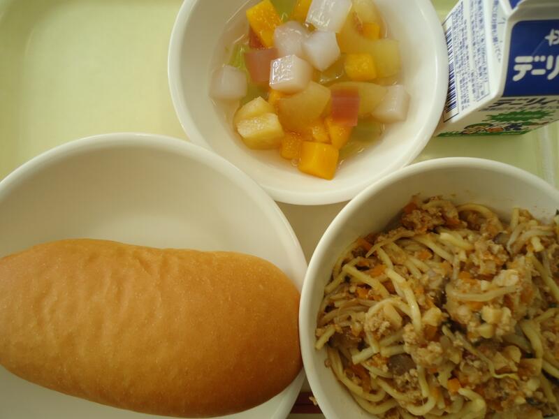 今日の給食のメニューは、ジャージャー麺、フルーツポンチ、減量コッペパン、牛乳です。
