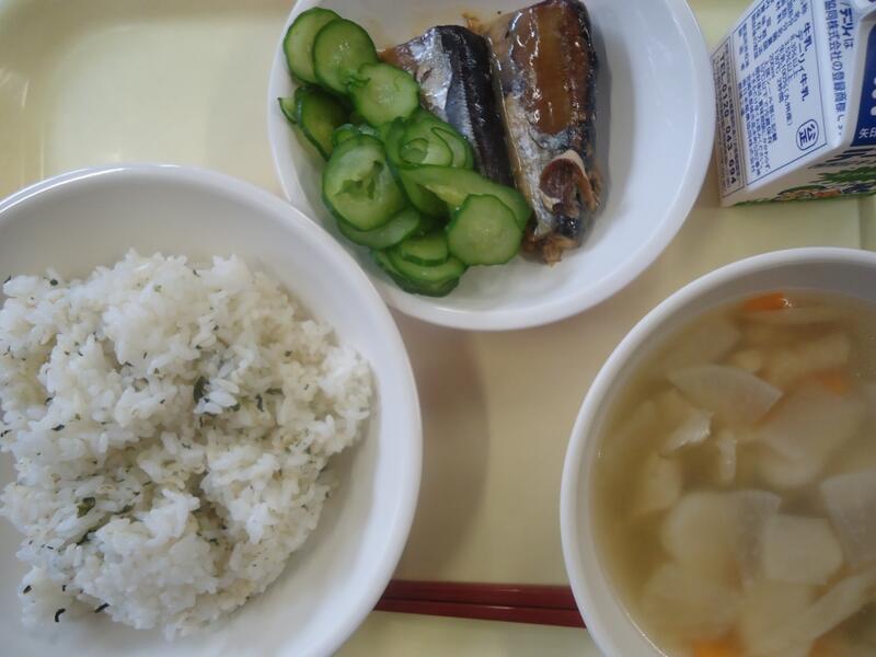 大根葉ごはん、牛乳、栄養すいとん、さんまのゆずみそ煮、きゅうり