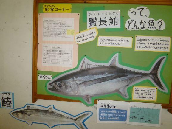いつも児童が大変興味を引く掲示物があります。最近は、写真のようにびんちようまぐろとさわらの写真も掲示してあります。今日の給食にもまぐろがありましたが、こんな写真があると児童は「おやっ」といった感じで見ます。