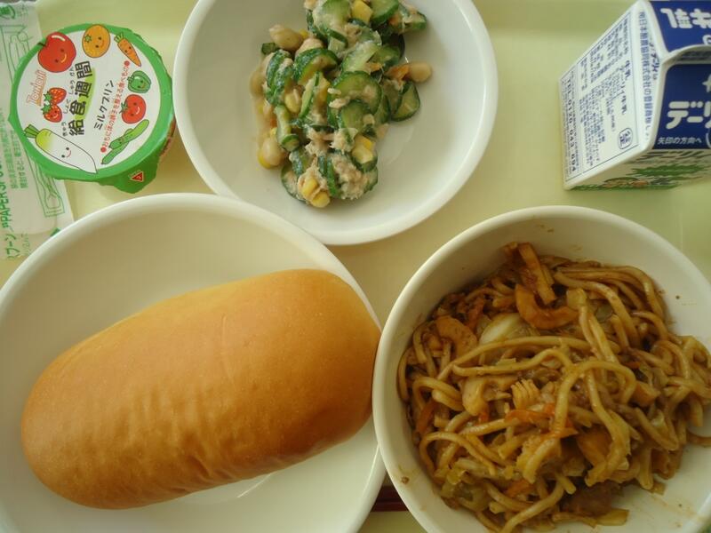 減量チーズパン、牛乳、焼きそば、大豆とツナのサラダ、給食週間ミルクプリン
