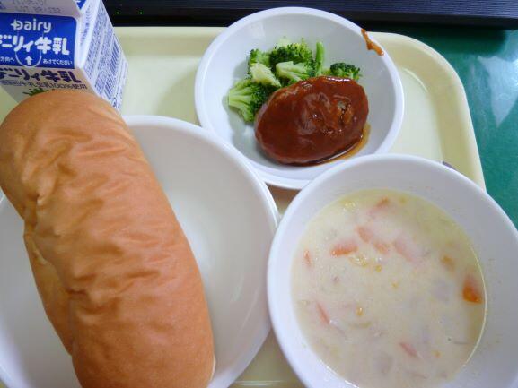 コッペパン、コーンチャウダー、煮込みハンバーグ、ブロッコリー