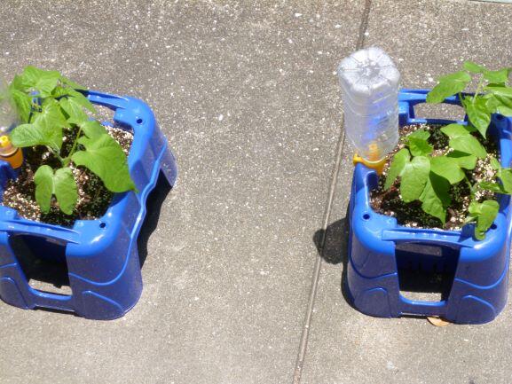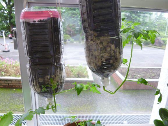 写真はただいま実験中の、ペットボトルによるミニトマトの栽培です。どれだけ実がなるか、時折、ここにもアップします。植えて5日目です。