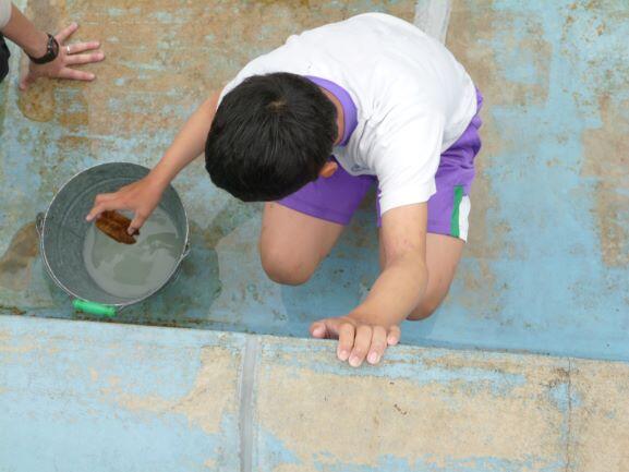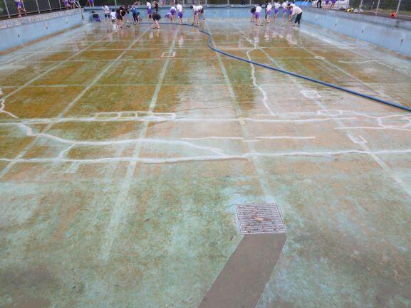 金曜日に6年児童と職員とで行いました。昨年は、この時期が臨時休業でしたので、職員で清掃しましたが、結局、プールでの授業はできませんでした。今年は、今のところ、行う予定でいます。例年通り、床面と壁面には藻がはっていて、なかなかとれませんでしたが、たわしやデッキブラシでごしごしこすりながら、きれいにしました。