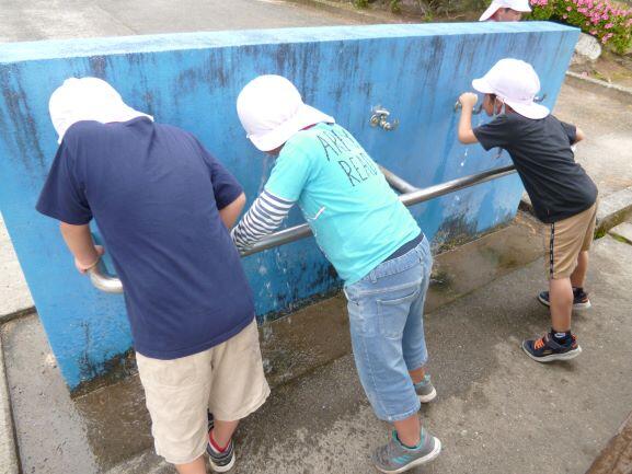 昼休み時間になると、多くの子どもたちが外で元気に走り回っています。顔を真っ赤にして遊んでいる子どもも多数います。当然のことながら、のどが渇くんでしょうね。写真のように、水道のところで「ごくごく」と音がしているような感じで水を飲む姿を多く見かけます。