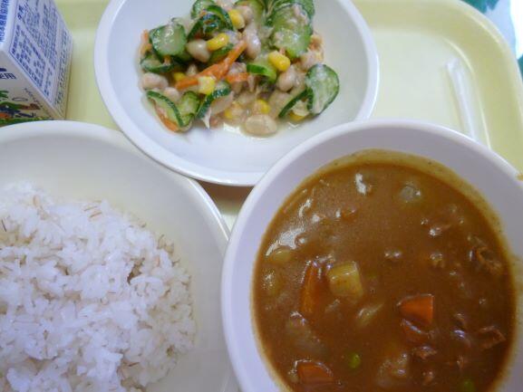 ポークカレー、ツナと大豆のサラダ、麦ご飯