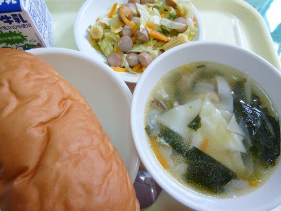 ミルクパン、ワンタンスープ、ウインナーと野菜のソテー