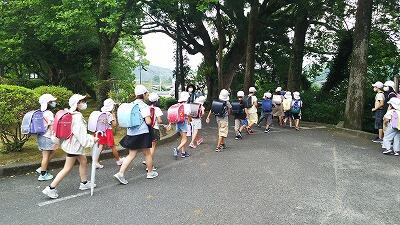 先週、子どもたちは各学級の学級活動の時間に台風や大雨等の災害に関するDVD教材を使って、その恐ろしさや避難の仕方等を学習してきています。今日は、実際に大雨を想定しての集団下校訓練を行いました。始めに、生活指導の担当職員が校内放送で大雨の時の注意事項を指導した後、地区ごとに分かれて集団下校を行いました。5・6年生が低学年の子どもたちの様子を気遣いながら下校していく姿を見ていて、とても頼もしく思えました。