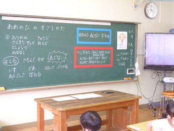 今日は1年生の授業研究会を行いました。定期的に行っている会で、お互いに授業を見合いながら事後に研究会を設定し、授業改善に活かすというものです。今日は、1年生の「雨の日の過ごし方について」をテーマにした授業でした。テレビ画面に映された「雨の日の過ごし方」を観て、自分なりの考えを元気よく発表する姿を見ることができました。