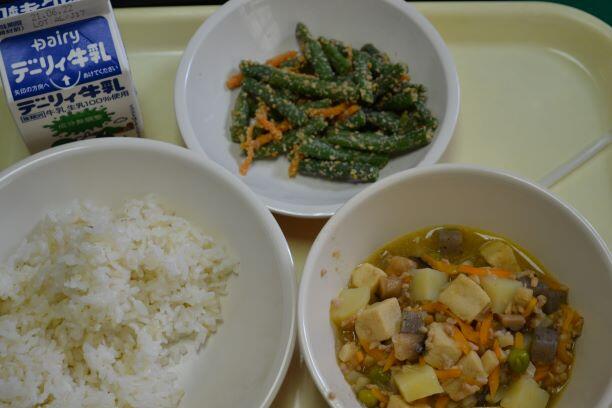 麦ご飯、高野豆腐のそぼろに、インゲンのごま和え
