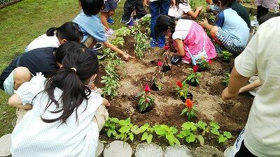 校内の学級園にポーチュラカ、メランポジウム、日々草など夏の草花を植えました。各クラス、朝のボランティアの時間や昼休み等時間を見つけて、友だちと協力しながら、楽しそうに活動していました。植え方は、それぞれのクラスで違いがあり、これからの成長が楽しみです。