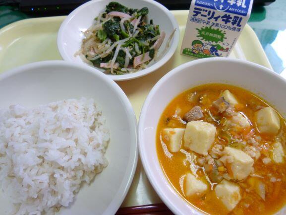 麦ご飯、肉豆腐、ほうれん草の磯香和え
