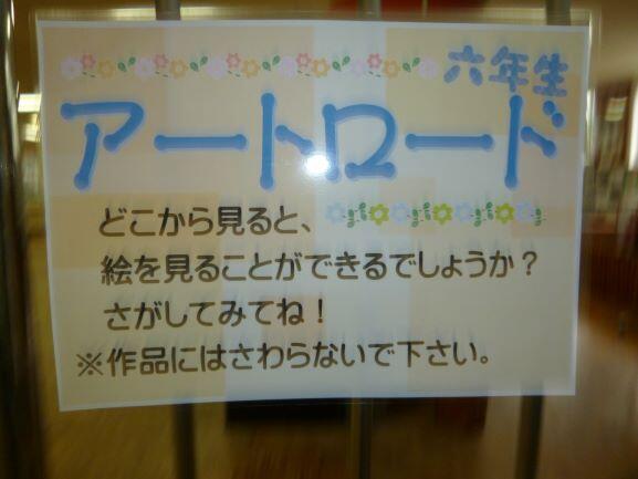 アートロード、6年生が作成したものです。階段を中心に校内に貼ってあります。あえてずらして貼っている作品です。いくつかを紹介します。