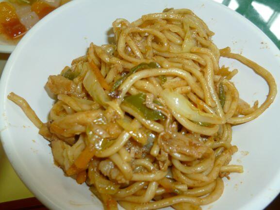焼きそばは、少し太めの麺であまり辛くありません。いかがたくさん入っていました。