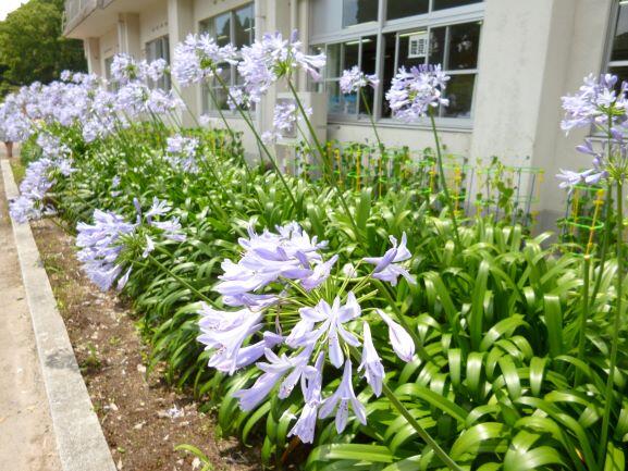 今年も職員室外側にある花壇のアガパンサスが満開の時季を迎えています。この花は、百合科の多年草で、毎年、5月下旬から7月頃にかけて光沢と厚みのある葉の中から、花火のような放射状の涼やかな青色の花を咲かせてくれます。大変丈夫で、特に何の手入れもしないで、毎年咲かせてくれます。
