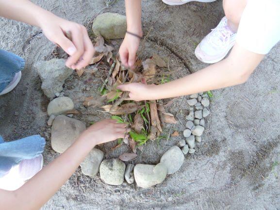 6年生が図工の学習で自然の事物を活かしたアート作品を作っていました。グループごとに、砂場や遊具、地面の上で相談しながら作っていました。作った作品は、タブレットで写真を撮って教室で見合うそうです。