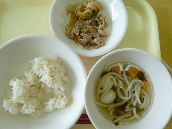 魚うどんのすまし汁、豚肉となすの炒め物