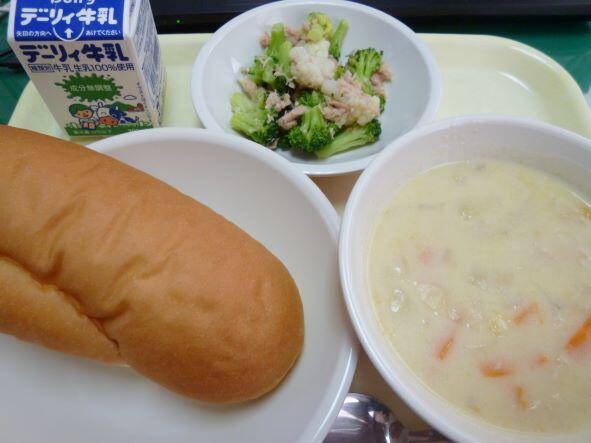今日のメニューは「コッペパン、コーンチャウダー、ブロッコリーサラダ」でした。