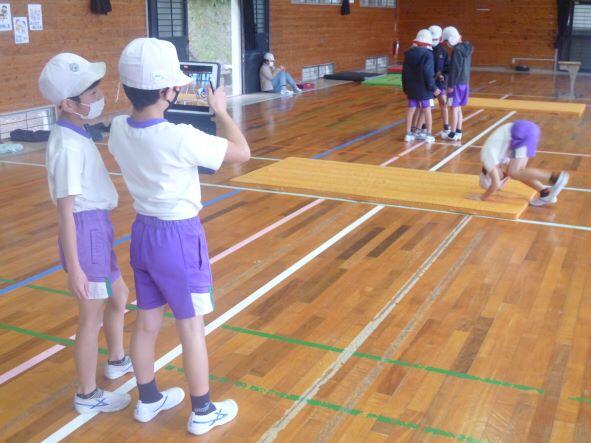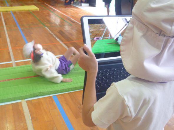 児童一人に一台ずつタブレットを配付して授業で活用していることはご存じと思います。今日は、3年生の体育(マット運動)で、それを活用して授業していました。児童は、グループに分かれ、グループ内の他の児童の運動する姿を撮り、お互いに見て話し合いながら、課題解決を図っていました。