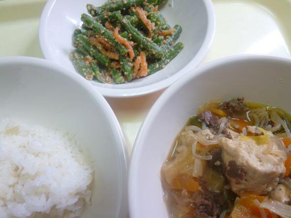 宮崎牛のすき焼き、インゲンのごま和え、麦ご飯