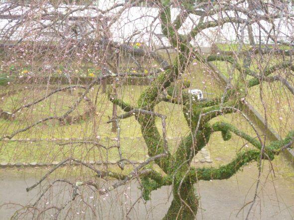 中庭のしだれ梅の花がちらほらと咲き始めました。昨年も、満開の時にはとてもきれいな姿を見せてくれましたが、今年も開花が始まっています。しばらくすると満開の時期を迎えることでしょう。楽しみです。