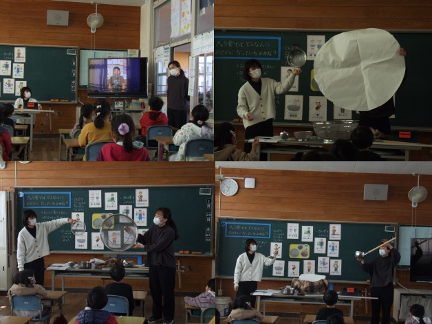 2年生の学級活動の時間に学校給食について学習しました。調理場で給食ができるまでを撮影したビデオを見た後、宮田知佳栄養教諭から、実際に調理で使用している道具を紹介してもらいました。家庭にある道具との違いに驚きの声が上がり、子どもたちは、毎日たくさんの方々にお世話になって出来ている給食をいただいていることに改めて気づき、感謝の思いをもつことができたようでした。