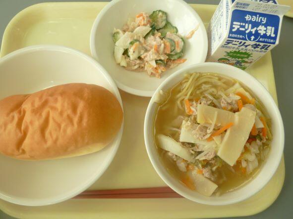 今日のメニュー チリコンカン、しめじのすのもの、パン 、牛乳