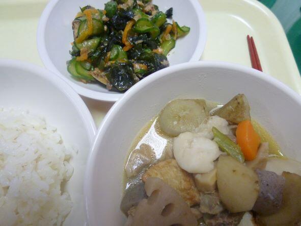 丸麦ご飯、じゃがいものすいとん、肉野菜炒め