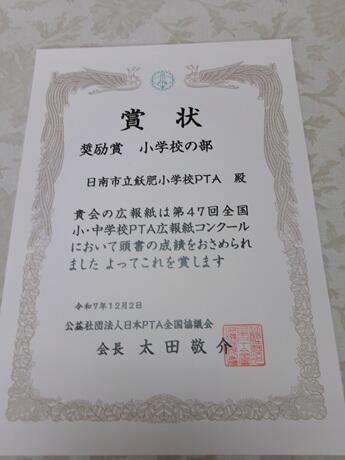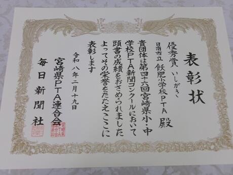 本校のPTA新聞「いしがき」が、全国小・中学校PTA広報紙コンクールにおいて奨励賞を、宮崎県小・中学校PTA新聞コンクールにおいて優秀賞をそれぞれ受賞しました。本校のPTA活動の取組のよさが評価されました。おめでとうございます。