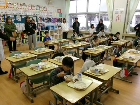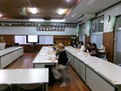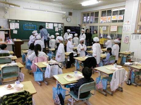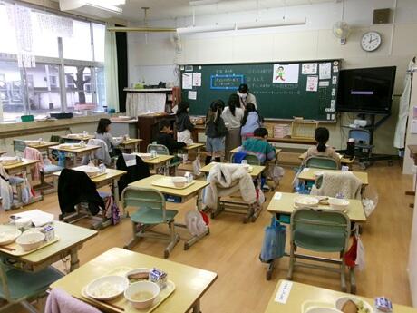 1年生教室で給食の配膳の様子を参観していただいた後に、試食会でした。