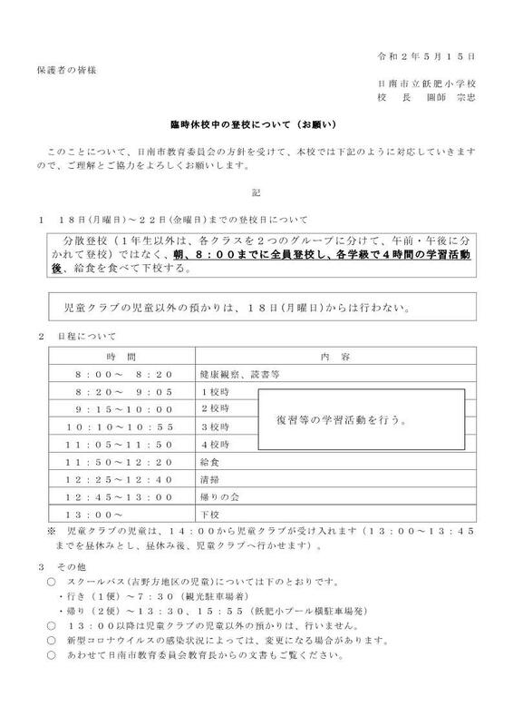 ・来週の予定が変わりました。全員8:00までに登校(通常と同じ)、4時間授業の後、給食、清掃、下校です。下校時刻は13:00~です。本日まで行っていました「預かり」は来週からはありません。ただし、児童クラブは14:00~いつも通りにありますので、該当児童は、13:00~昼休み、その後、一度教室に戻りランドセルを持って
