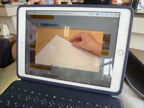 昨年度末に1~6年生まで全員にタブレットを配付しました。今、少しずつですがそれを授業の中で使用しています。今日は5,6時間目に6年生が家庭科の授業で使用していました。活動としてはナップザック作りをしているのですが、その作り方の一端をグループごとにタブレットで観て参考にしていました。