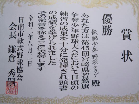 少年野球チームの数名が、朝、下の表彰状を見せてくれました。若鷹杯での優勝の賞状です。昨日、決勝戦があったようで見事に優勝、日頃の練習の成果が現れてよかったです。指導していただいている監督さんはじめ保護者の皆様、本当におめでとうございます。今後もどうぞよろしくお願いします。