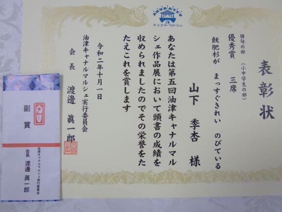 これは先日行われました油津キャナルマルシェ作品展で入賞した児童の俳句です。賞状等が届きましたのでご紹介します。
